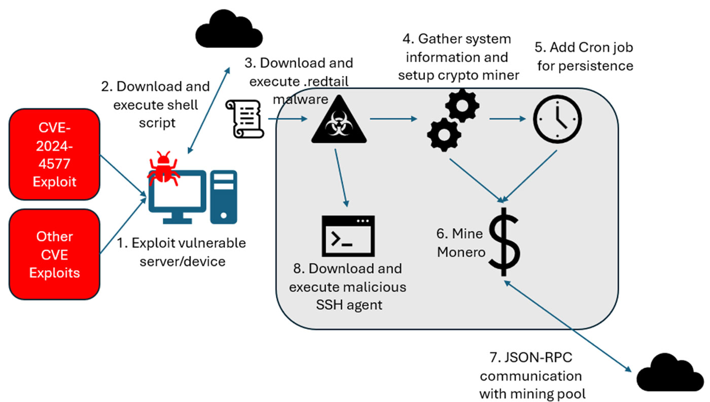 RedTail gains initial access to targeted environments often through content management systems or plugins running on vulnerable PHP servers. Once inside, it leverages a multifaceted approach: deploying a malicious SSH agent to steal SSH credentials, using XMRig for covert cryptocurrency mining, and maintaining stealth through encrypted JSON-RPC communications with a mining pool. This combination of tactics facilitates financial gain through illicit mining operations and poses significant risks to data integrity and system availability.