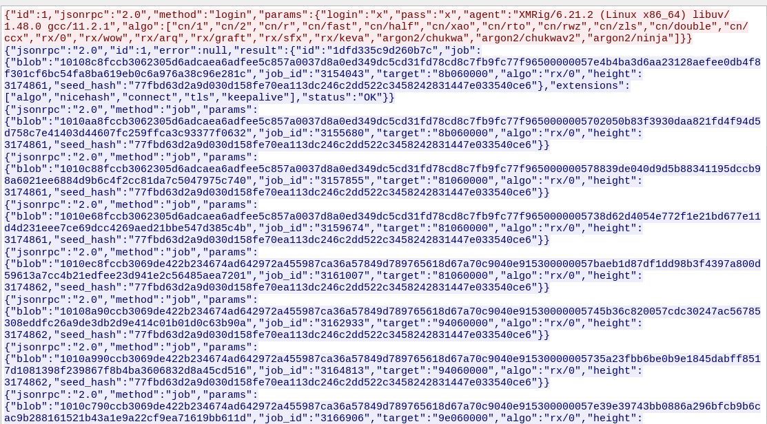 - Configure XMRig. After infection, RedTail uses XMRig to exploit the system’s processing power to mine Monero. This process involves running the mining software in the background, usually without the user’s knowledge, which can significantly slow down the infected machine and increase its power consumption. The mined cryptocurrency is then sent to wallets controlled by the attackers, providing them with financial gains at the expense of the compromised system’s performance and the victim’s resources.