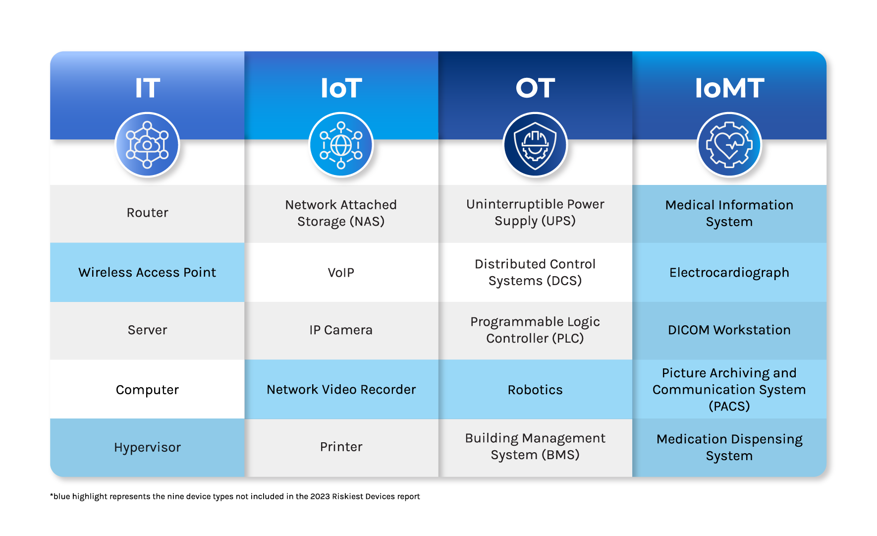 • A highly detailed breakdown of the riskiest devices across all categories in: IT, IoT, OT and IoMT.